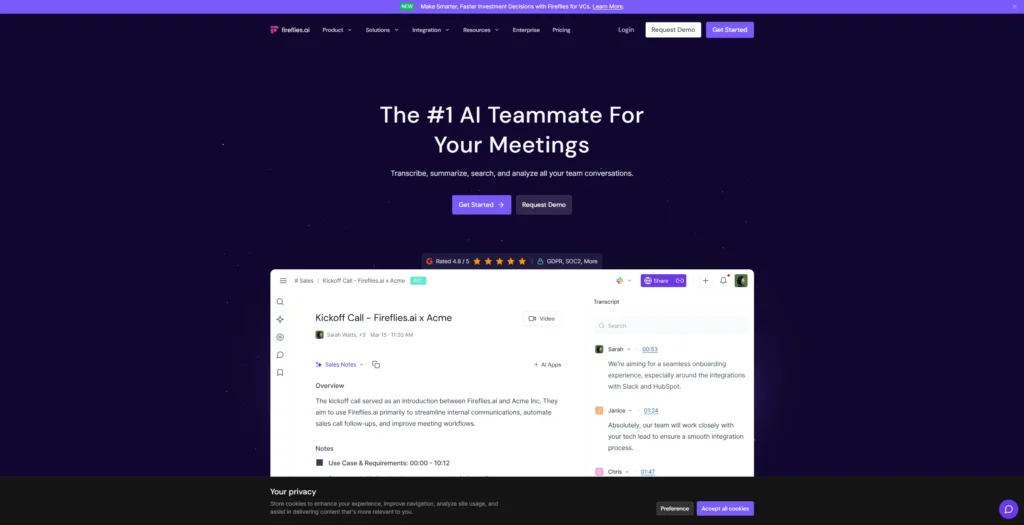 Fireflies.ai automatically records, transcribes, and summarizes your online meetings.