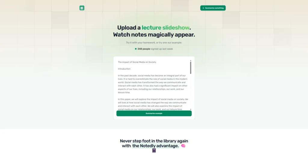Notedly AI is a tool for students and teachers. It takes class recordings or text and turns them into summaries. It works best for academic content like lectures, study sessions, or research reviews. Users can upload files, and the AI creates notes for study or sharing.